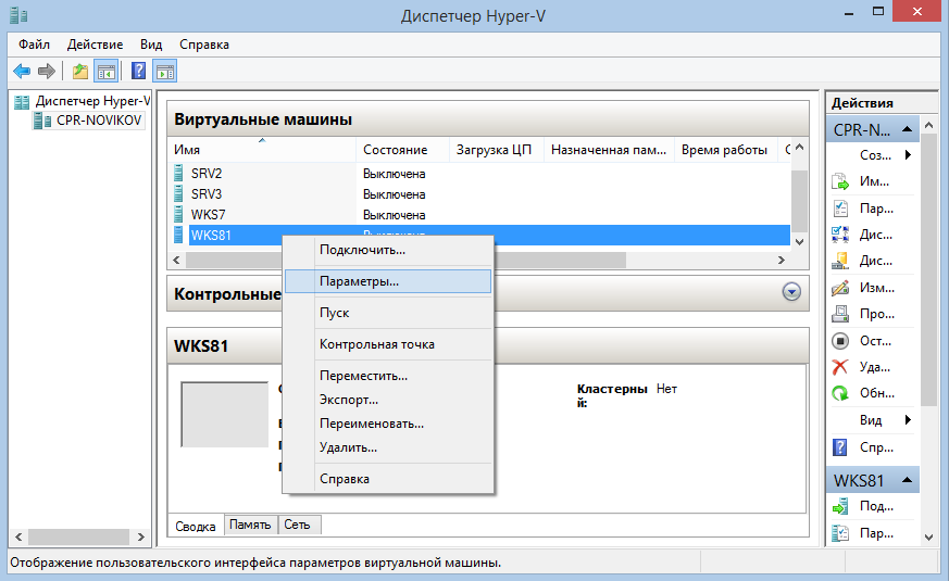 Для изменения параметров открываем Hyper-V Manager, выбираем виртуальную машину, кликаем на ней правой клавишей мыши и выбираем пункт меню «Параметры».