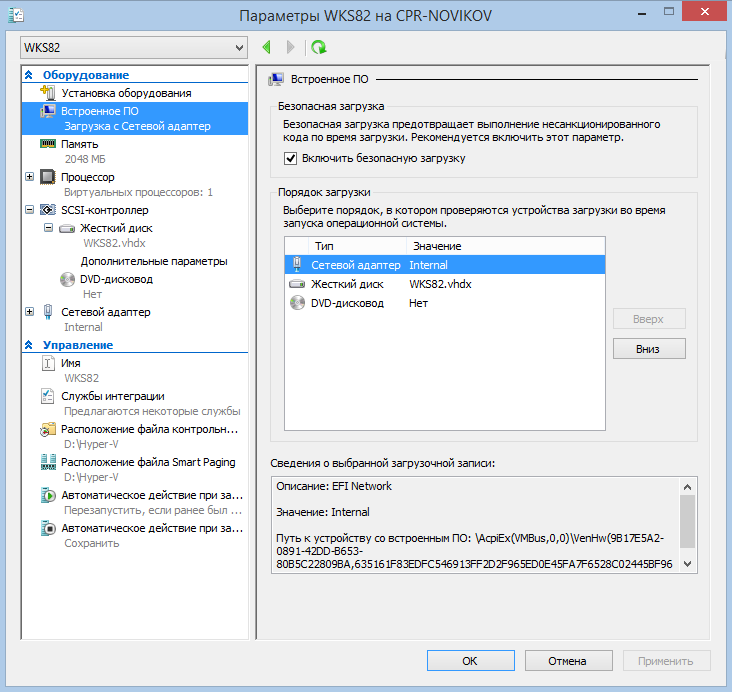 У ВМ второго поколения вместо BIOS используется UEFI, а соответствующая вкладка называется Встроенное ПО (Firmware). Во втором поколении ВМ не используются legacy устройства, и для загрузки можно выбрать обычный сетевой адаптер или SCSI-диск, а также включить механизм безопасной загрузки (Secure Boot).