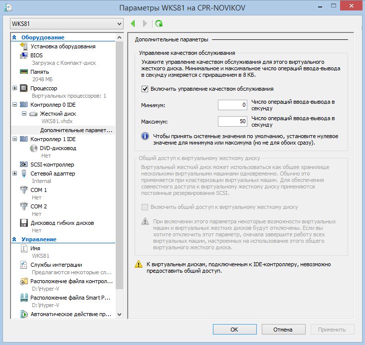 Также в дополнительных свойствах диска есть возможность включить управление качеством обслуживания и указать для виртуального диска минимальное и максимальное количество дисковых операций (IOPS). Это позволяет регулировать нагрузку, создаваемую виртуальными машинами на дисковую подсистему компьютера. Для ориентира приведу средние значения IOPS для различных типов дисков: