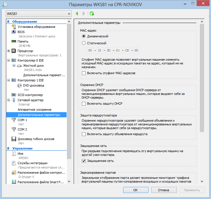 • MAC-адрес — можем оставить динамический, на усмотрение Hyper-V, или указать вручную;