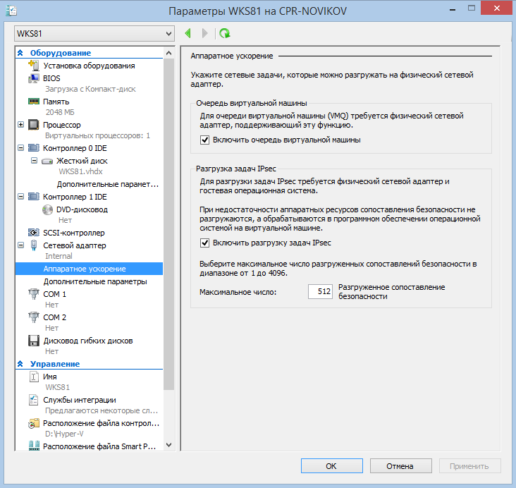 • Очередь виртуальной машины (VMQ) — включение этой настройки позволяет перенести основную нагрузку по обработке сетевых пакетов, адресованных виртуальной машине, с центрального процессора хостовой системы на процессор сетевого адаптера. Это возможно при аппаратной поддержке VMQ сетевым адаптером и установленных в гостевой ОС сервисах интеграции.