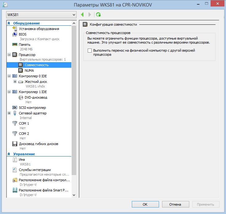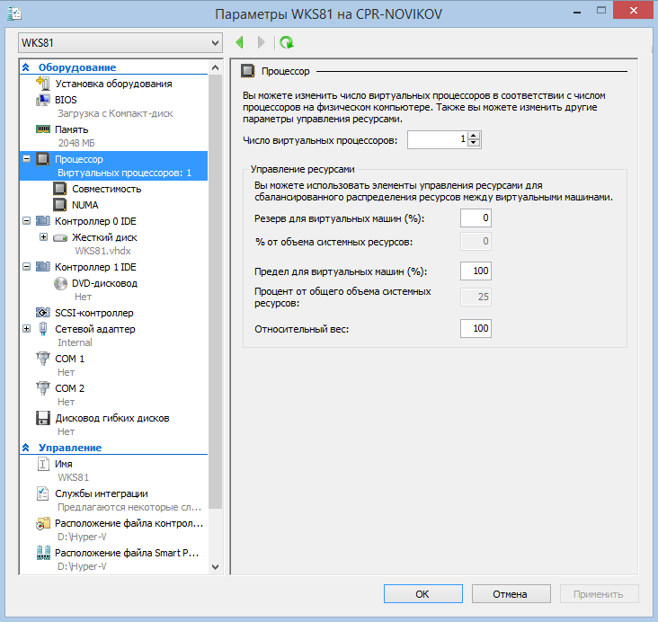 Далее идет вкладка «Процессор». Здесь мы можем указать количество виртуальных процессоров, выделяемых этой ВМ. В качестве виртуального процессора может выступать либо физическое ядро процессора, либо вычислительный поток (при использовании Hyper-Threading). Hyper-V позволяет выделить до 64 процессоров для одной ВМ. Также обратите внимание на поле «Процент от общего объема системных ресурсов», в котором отображается процент от общей процессорной мощности, выделенный данной ВМ. В моем случае это одно ядро четырехъядерного процессора, что составляет 25% от общей мощности.