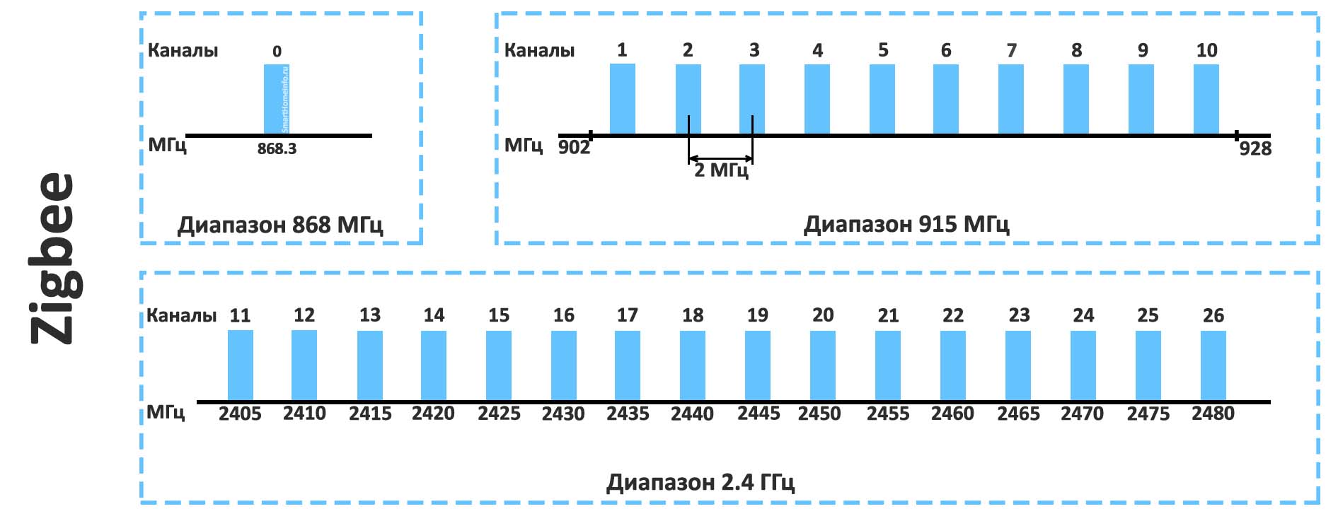 Сети Зигби могут работать в трех частотных диапазонах: 868 и 915 МГц, а также в частотном диапазоне 2.4 ГГц, который и используется в большинстве стран мира. На 868 МГц доступен один канал, на 915 МГц – десять, а на 2.4 ГГц – 16 каналов: