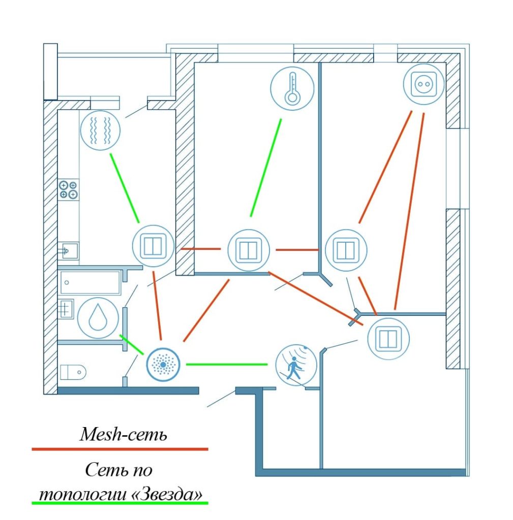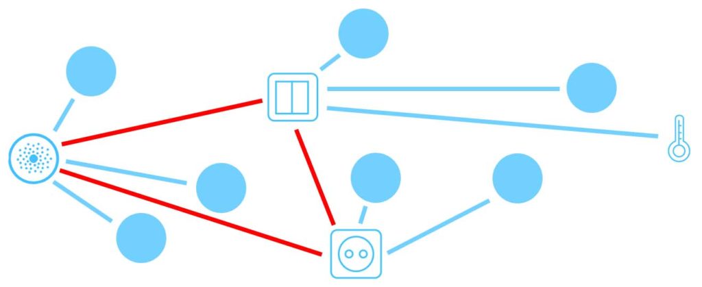 - расположенный в дальнем углу комнаты датчик температуры передает все показания через выключатель, являющийся маршрутизатором. В случае, если выключатель выйдет из строя, датчик или напрямую подключится к шлюзу, или передаст все показания через другой маршрутизатор (например, через розетку справа). Таким образом работоспособность сети не нарушится и все данные будут доставлены.