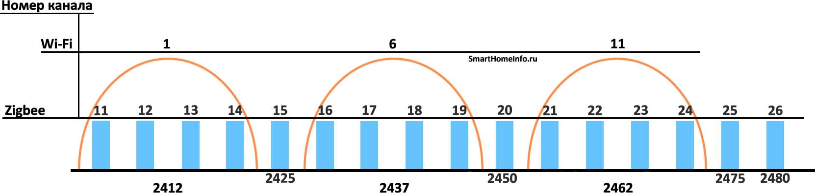 Все Зигби устройства Xiaomi, Aqara и других популярных производителей работают в диапазоне 2.4 ГГц. В нем же, как мы знаем, работает и Wi-Fi, и Bluetooth, и множество других беспроводных сетей. Что это значит? При пересечении каналов Zigbee и Wi-Fi начнут мешать друг другу. На картинке ниже показаны первый, шестой и одиннадцатый (непересекающиеся) каналы Wi-Fi, а также все 16 каналов Зигби.