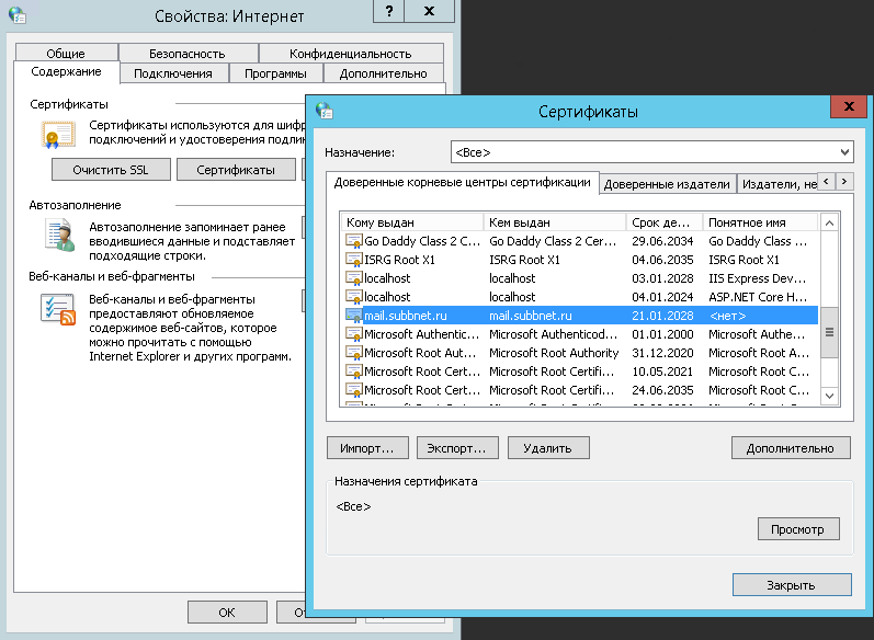 Теперь откроем хранилище сертификатов. Проще всего это сделать через Internet Explorer: Свойства обозревателя - Содержание - Сертификаты. Наш сертификат должен присутствовать в контейнере Доверенные корневые центры сертификации.