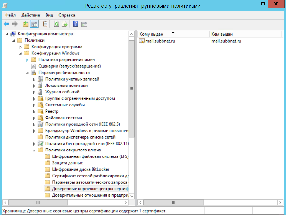 Конфигурация компьютера → Политики → Конфигурация Windows → Параметры безопасности → Политики открытого ключа → Доверенные корневые центры сертификации.