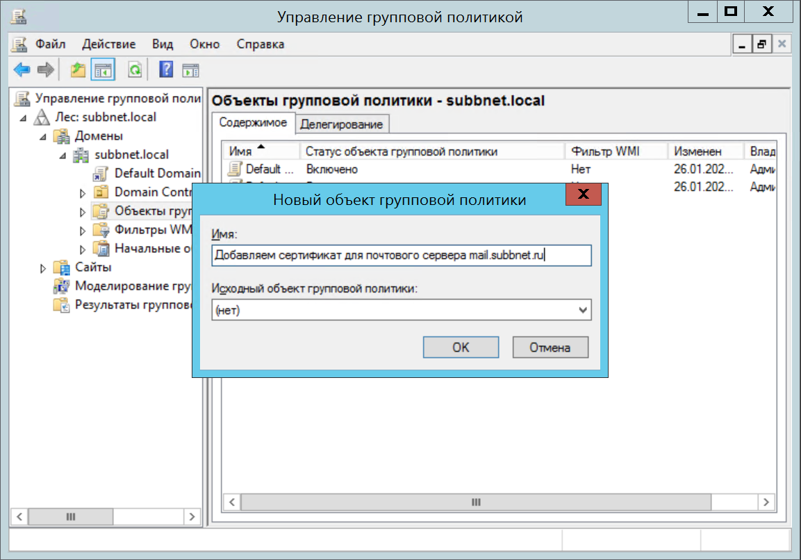 Далее настраиваем GPO. Откроем оснастку Управление групповой политикой и создадим новую политику в контейнере Объекты групповой политики, для этого щелкните на контейнере правой кнопкой и выберите Создать. Политика позволяет устанавливать как один, так и несколько сертификатов одновременно, как поступить - решать вам, мы же предпочитаем создавать для каждого сертификата свою политику, это позволяет более гибко менять правила их применения. Также следует задать политике понятное имя, чтобы открыв консоль через полгода вам не пришлось мучительно вспоминать для чего она нужна.