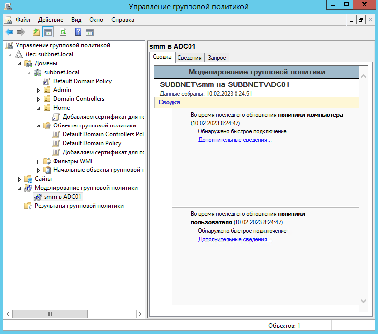 Выполнив моделирование можем убедиться, что политика успешно применяется к указанному компьютеру, в противном случае раскрываем пункт Отклоненные объекты и смотрим причину по которой политика оказалась неприменима к данному пользователю или компьютеру.