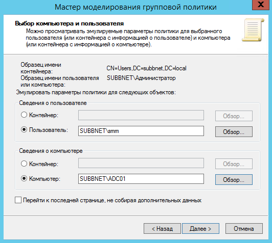 Большинство параметров можно оставить по умолчанию, единственное что следует задать - это пользователя и компьютер для которых вы хотите проверить политику.