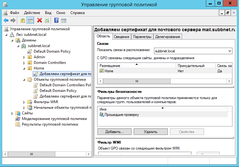 Как видим - все работает и одной головной болью у администратора стало меньше, сертификат будет автоматически распространяться на все компьютеры помещенные в подразделение Home. При необходимости можно задать более сложные условия применения политики, но это уже выходит за рамки данной статьи.