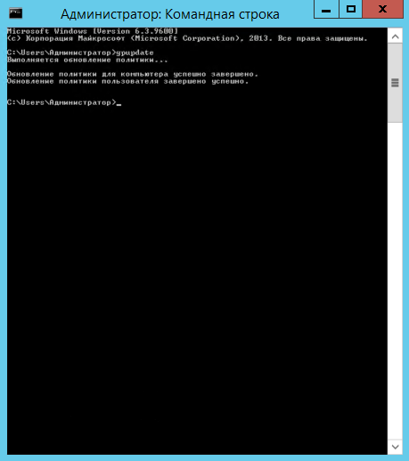 После чего проверим работу политики на клиентском ПК, для этого обновим политики вручную командой: