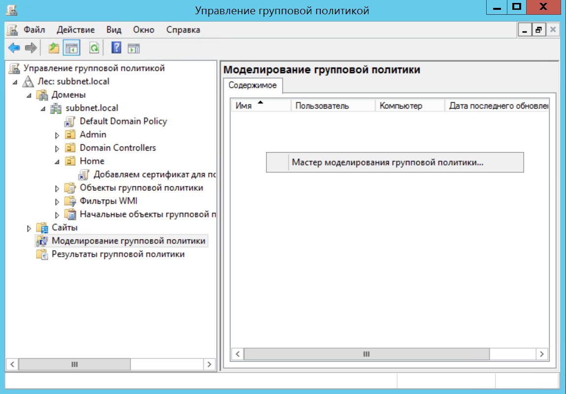 Политика создана, теперь самое время проверить правильность ее применения. В оснастке Управление групповой политикой выберем Моделирование групповой политики и запустим по правому щелчку Мастер моделирования.