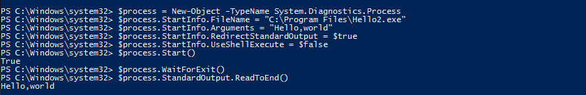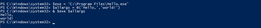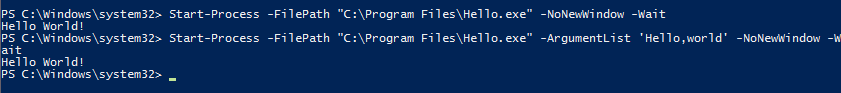 Start-Process -FilePath ′C:\Program Files\Hello.exe′ -ArgumentList ′Hello, world′ -NoNewWindow -Wait