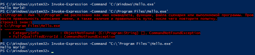 Invoke-Expression -Command ′C:\Windows\Hello.exe′Однако у него есть один большой недостаток, а именно — неумение работать с пробелами. К примеру, следующая команда вызовет ошибку: