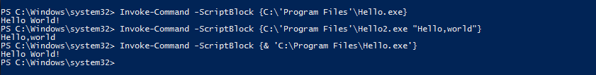Invoke-Command -ScriptBlock {& ′C:\Program Files\Hello.exe′}