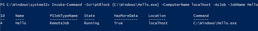 Invoke-Command -ScriptBlock {C:\′Program Files′\Hello.exe} -ComputerName localhost -AsJob -JobName Hello