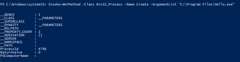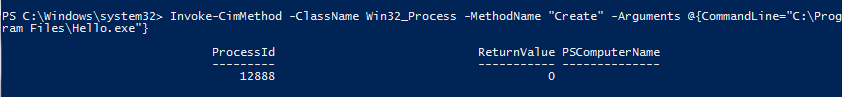 Invoke-CimMethod -ClassName Win32_Process -MethodName Create -Arguments @{CommandLine=″C:\Program Files\Hello.exe″}
