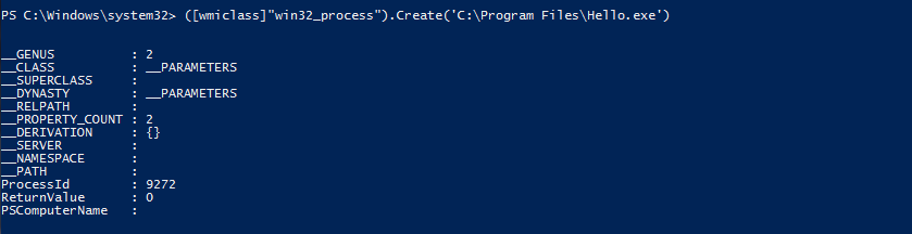 ([wmiclass])″\\remotecomputer\root\cimv2:Win32_Process″).Create(′C:\Program Files\Hello.exe′)