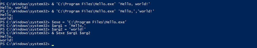 & ′C:\Program Files\Hello.exe′ ′Hello, world′При желании можно указать нескольких аргументов через запятую: