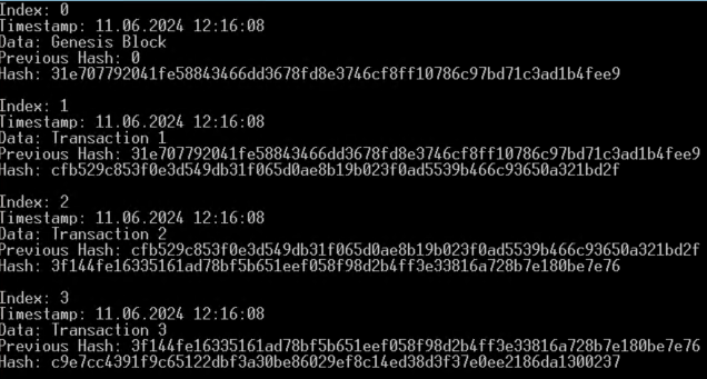 3. Program: Точка входа в программу, демонстрирующая, как использовать класс BlockchainManager для создания простого блокчейна, добавления нескольких блоков и проверки его целостности.