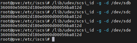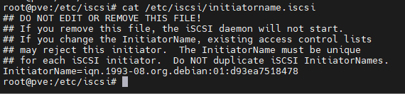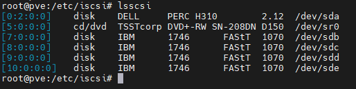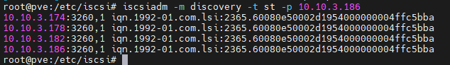 iscsiadm -m nodeiscsiadm -m session -P 1root@pve:/etc/iscsi# iscsiadm -m session -P 1Target: iqn.1992-01.com.lsi:2365.60080e50002d1954000000004ffc5bba (non-flash) Current Portal: 10.10.3.178:3260,1 Persistent Portal: 10.10.3.178:3260,1 ********** Interface: ********** Iface Name: default Iface Transport: tcp Iface Initiatorname: iqn.1993-08.org.debian:01:d93ea7518478 Iface IPaddress: 10.10.0.8 Iface HWaddress: default Iface Netdev: default SID: 3 iSCSI Connection State: LOGGED IN iSCSI Session State: LOGGED_IN Internal iscsid Session State: NO CHANGE Current Portal: 10.10.3.174:3260,1 Persistent Portal: 10.10.3.174:3260,1 ********** Interface: ********** Iface Name: default Iface Transport: tcp Iface Initiatorname: iqn.1993-08.org.debian:01:d93ea7518478 Iface IPaddress: 10.10.0.8 Iface HWaddress: default Iface Netdev: default SID: 4 iSCSI Connection State: LOGGED IN iSCSI Session State: LOGGED_IN Internal iscsid Session State: NO CHANGE Current Portal: 10.10.3.186:3260,1 Persistent Portal: 10.10.3.186:3260,1 ********** Interface: ********** Iface Name: default Iface Transport: tcp Iface Initiatorname: iqn.1993-08.org.debian:01:d93ea7518478 Iface IPaddress: 10.10.0.8 Iface HWaddress: default Iface Netdev: default SID: 5 iSCSI Connection State: LOGGED IN iSCSI Session State: LOGGED_IN Internal iscsid Session State: NO CHANGE Current Portal: 10.10.3.182:3260,1 Persistent Portal: 10.10.3.182:3260,1 ********** Interface: ********** Iface Name: default Iface Transport: tcp Iface Initiatorname: iqn.1993-08.org.debian:01:d93ea7518478 Iface IPaddress: 10.10.0.8 Iface HWaddress: default Iface Netdev: default SID: 6 iSCSI Connection State: LOGGED IN iSCSI Session State: LOGGED_IN Internal iscsid Session State: NO CHANGE