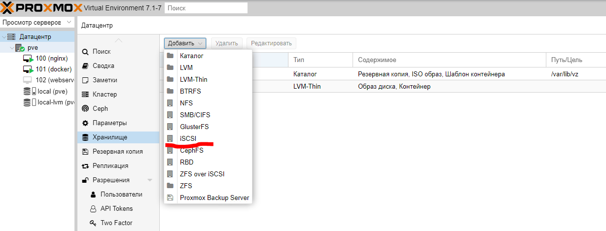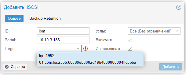 Таким образом, мы добавляем цель iSCSI в Proxmox.