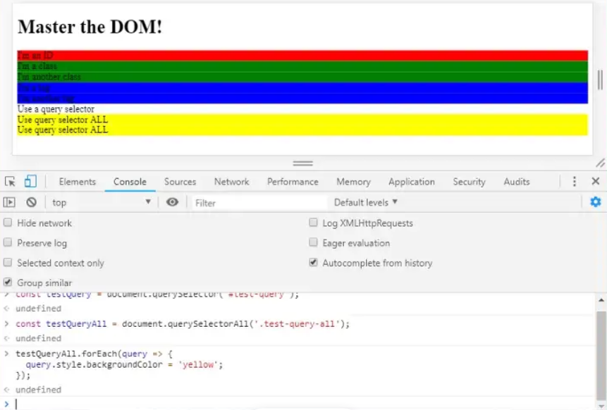 <div class=”test-query-all”>Use query selector ALL</div>Так как теперь мы работаем с атрибутом class, для доступа к элементам необходимо использовать точку .: