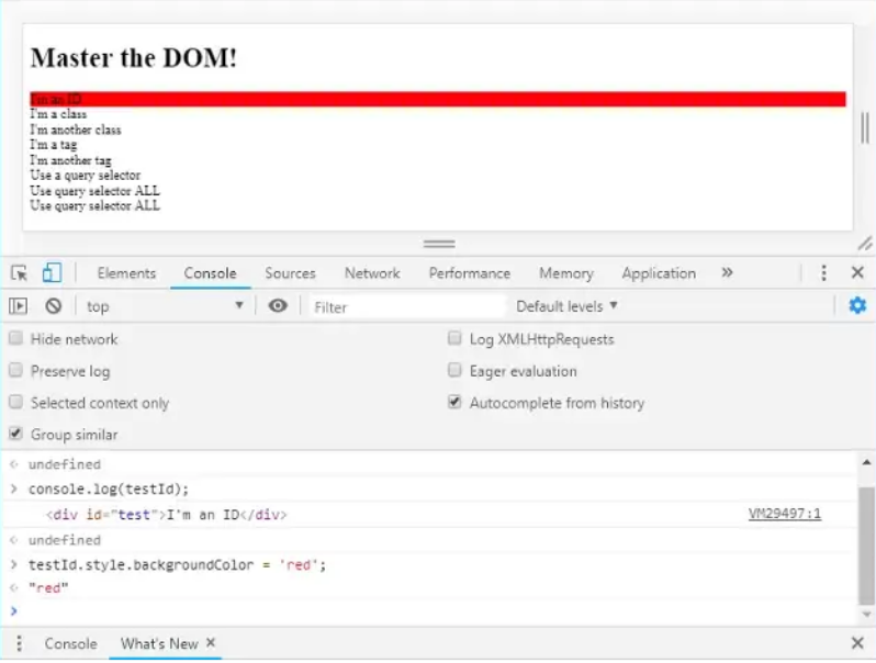 <div id=”test”>I’m an ID</div>В браузере с открытым HTML-файлом откройте вкладку Console в панели разработчика. Теперь присвоим этот элемент переменной testId.