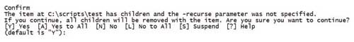 Remove-Item C:\Scripts\* -Include *.txt -Exclude *test*Будучи, по сути, опасным инструментом, Remove-Item предоставляется с парой элементов защиты. Прежде всего, если вы пытаетесь удалить все из папки, которая содержит непустые подпапки, вы получите запрос на подтверждение Confirm. Например, предположим, что C:\Scripts содержит непустые подпапки и вы запускаете такую команду: