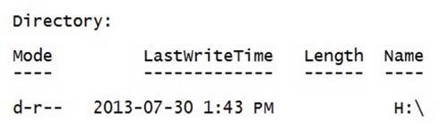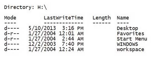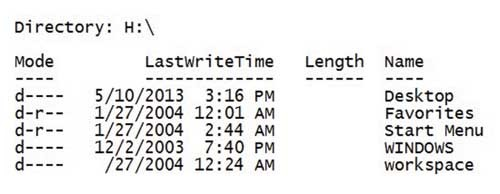Если использовать эту команду без параметров, она возвращает все дочерние элементы (такие как подпапки и файлы) в текущем местоположении. Например, если текущее местоположение – корневой каталог H, то запуская команду Get-ChildItem, вы получите результаты, похожие на те, что показаны на экране 1.