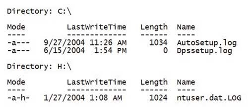 Get-ChildItem C:\*, * -Include *.log -ForceВ результатах примера на экране 2 обратите внимание на атрибут «h" в колонке Mode корневого каталога Н. Этот атрибут показывает, что файл ntuser.dat.LOG является скрытым. Это обнаруживается при помощи параметра –Force.