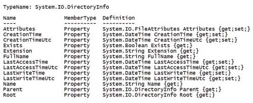 Результаты вы можете увидеть на экране 4. Важно понимать, что команды PowerShell, включая Get-Item, возвращают объекты. Команда Get-Item возвращает объекты System.IO.DirectoryInfo, которые содержат несколько методов и свойств, которые вы можете использовать. Чтобы увидеть эти методы и свойства, можно передать результаты команды Get-Item в команду Get-Member. Если вы хотите увидеть эти свойства, можете запустить такую команду: