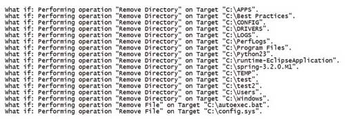 Remove-Item c:\* -Recurse -WhatIfРезультаты примера показаны на экране 8. Заметьте, что результаты могут включать в строку сообщение об ошибке Cannot remove the item at 'C:\Users' because it is in use. Такая ситуация возникает, если текущая рабочая папка является подпапкой каталога, которую вы пытаетесь удалить (в примере – подпапка корневого каталога С).