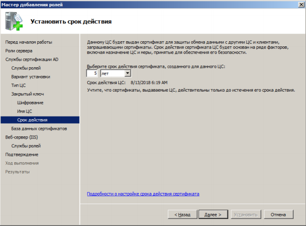 Выбираем срок действия сертификата ЦС. Для корневого ЦС мы оставили срок 10 лет, для подчиненного 5 лет, для сертификатов пользователей 1 год: