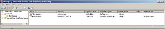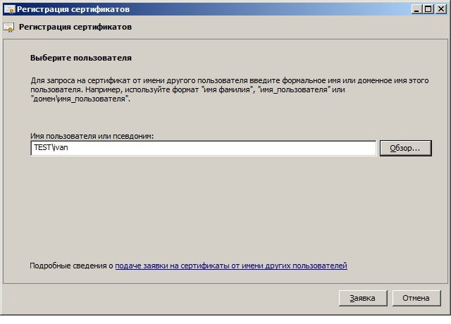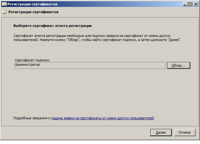 Для того чтобы запрашивать сертификаты необходимо запросить сертификат Агента запроса сертификата. Для этого делаем запрос от имени Администратора домена или пользователя с делегированными правами.