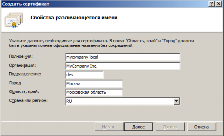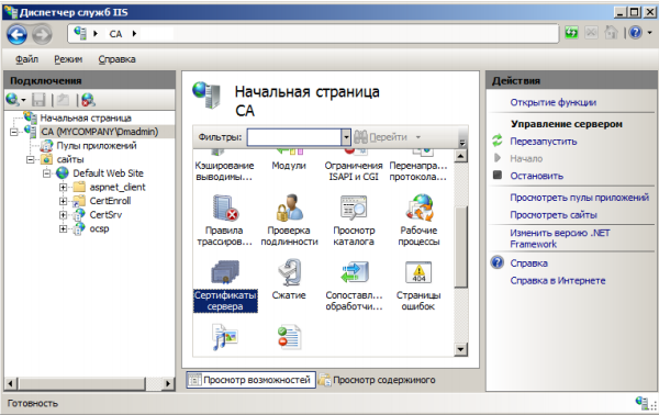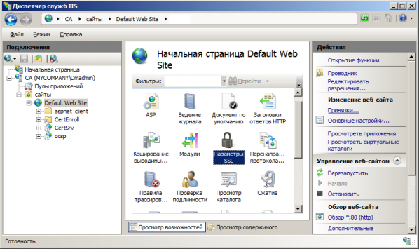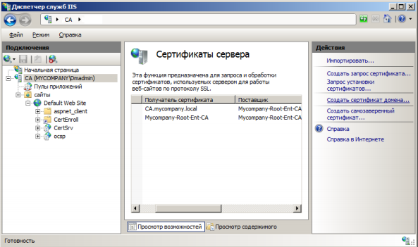 Итак, после установки у нас доступна служба регистрации по адресу http(s)://IP адрес или DNS имя сервера ЦС/certsrv. Настроем https протокол на IIS. Для корректной работы службы выдаче сертификатов необходимо создать сертификат домена и указать его роли IIS для протокола https.