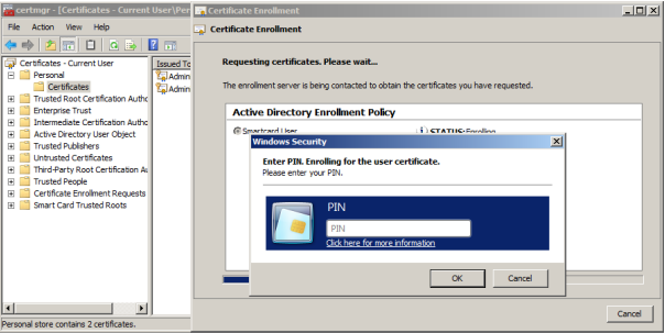 Для выдачи сертификата вставляем смарт-карту и вводим PIN от карты: