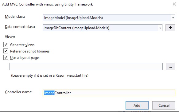 Чтобы обновлять и извлекать изображения, давайте создадим контроллер MVC. щелкните правой кнопкой мыши папку «Контроллеры» «Добавить»> «Контроллер», выберите «Контроллер MVC с представлениями с использованием шаблона Entity Framework». ImageControllerбудет создан с помощью ImageModelи ImageDbContext.