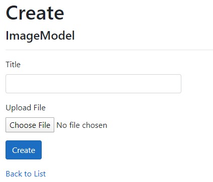 Теперь, если вы перейдете по URL: /Image/Create, вы увидите форму с элементами управления вводом, соответствующими каждому свойству модели, кроме ImageFile. поэтому мы должны заменить ImageName элементы управления вводом на загрузчик изображения/файла, соответствующий ImageFile свойству. Ведь Create.cshtmlдолжно выглядеть вот так.