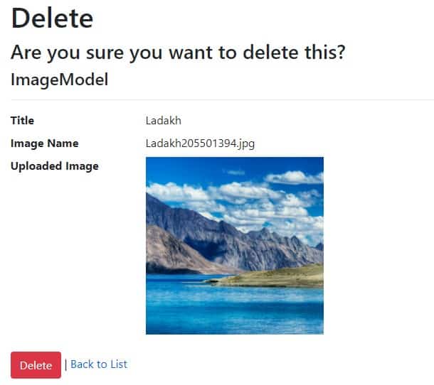 Если вы нажмете гиперссылку «Удалить», Delete откроется представление с отображением соответствующих сведений о записи. Чтобы отобразить загруженное изображение обратно в представление, мы должны внести несколько изменений в файл Views/Image/Delete.cshtml.