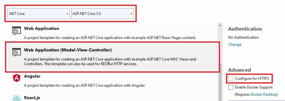 После того, как вы укажете название проекта и местоположение. Откроется новое окно следующего содержания: выберите «Веб-приложение (MVC)» и снимите флажок «Конфигурация HTTPS». Вышеуказанные шаги создадут новый проект ASP.NET Core MVC.