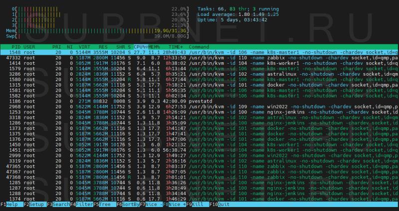 Как видно на скриншоте, htop гораздо лучше подходит для простой проверки степени загрузки процессора. Выход также осуществляется кнопкой q
