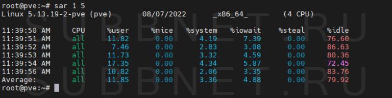 Следующая утилита в этом пакете это sar. Она наиболее полезна, если вы ее вводите вместе с каким-нибудь числом, например 6. Это определяет временной интервал, через который команда sar будет выводить информацию о загрузке ЦПУ.