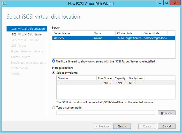 Настройка iSCSI таргета производится в консоли Server Manager. Обратите внимание, что запуск консоли должен осуществляться на том же узле, который в данный момент является владельцем роли iSCSI Target Server в кластере. В правой панели консоли Server Manager выберите File and Storage Services – iSCSI. Затем в меню TASKS выберите New iSCSI Virtual Disk…, запустится мастер создания нового виртуального iSCSI диска.