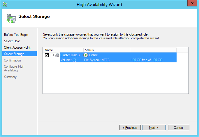 На шаге Select Storage определяется диск, который необходимо заранее добавить в консоли Failover Cluster Manager.