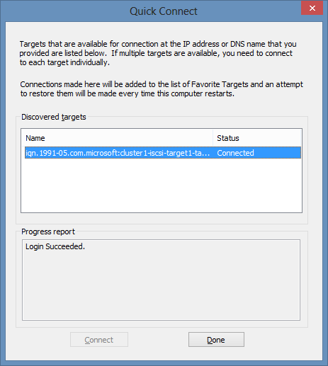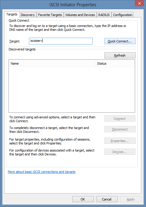 Для подключения к iSCSI Target в Windows 8 в панели управления откройте iSCSI Initiator Properties, на вкладке Targets в поле Target введите имя или IP адрес iSCSI сервера и нажмите Quick Connect.