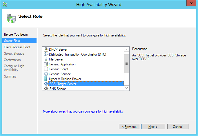 Далее в консоли Failover Cluster Manager необходимо запустить мастер добавления ролей кластера и выбрать роль iSCSI Target Server.