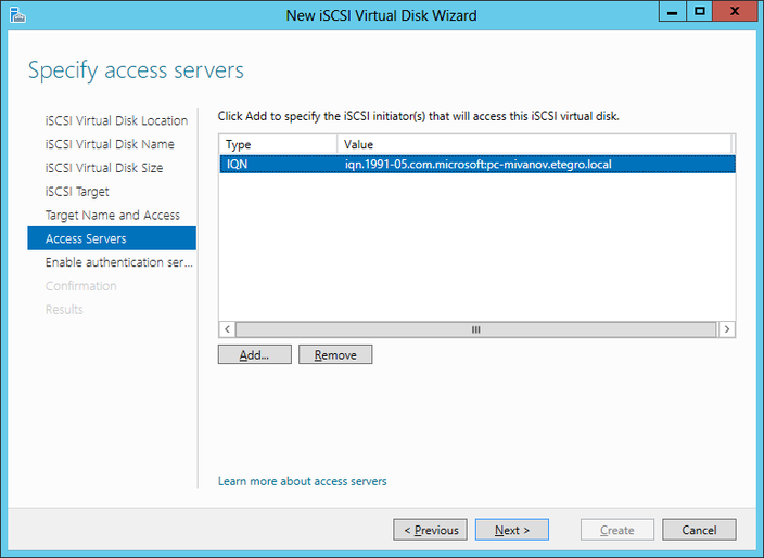 На шаге Access Servers добавляются инициаторы iSCSI, которым вы хотите разрешить доступ к iSCSI серверу. Существуют несколько методов добавления инициатора.