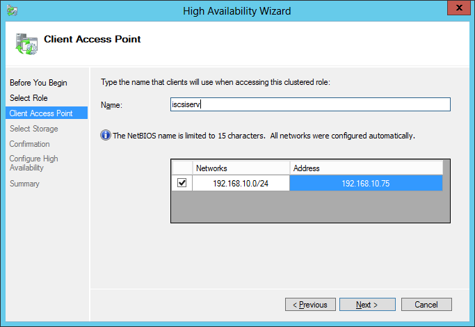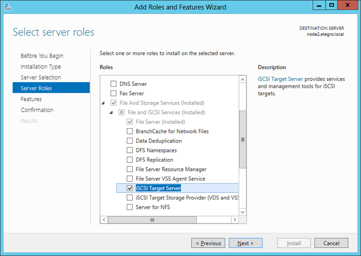 Перед настройкой роли iSCSI Target Server в кластере необходимо добавить роль iSCSI Target Server на каждый узел кластера с помощью мастера добавления ролей и компонентов в консоли Server Manager.